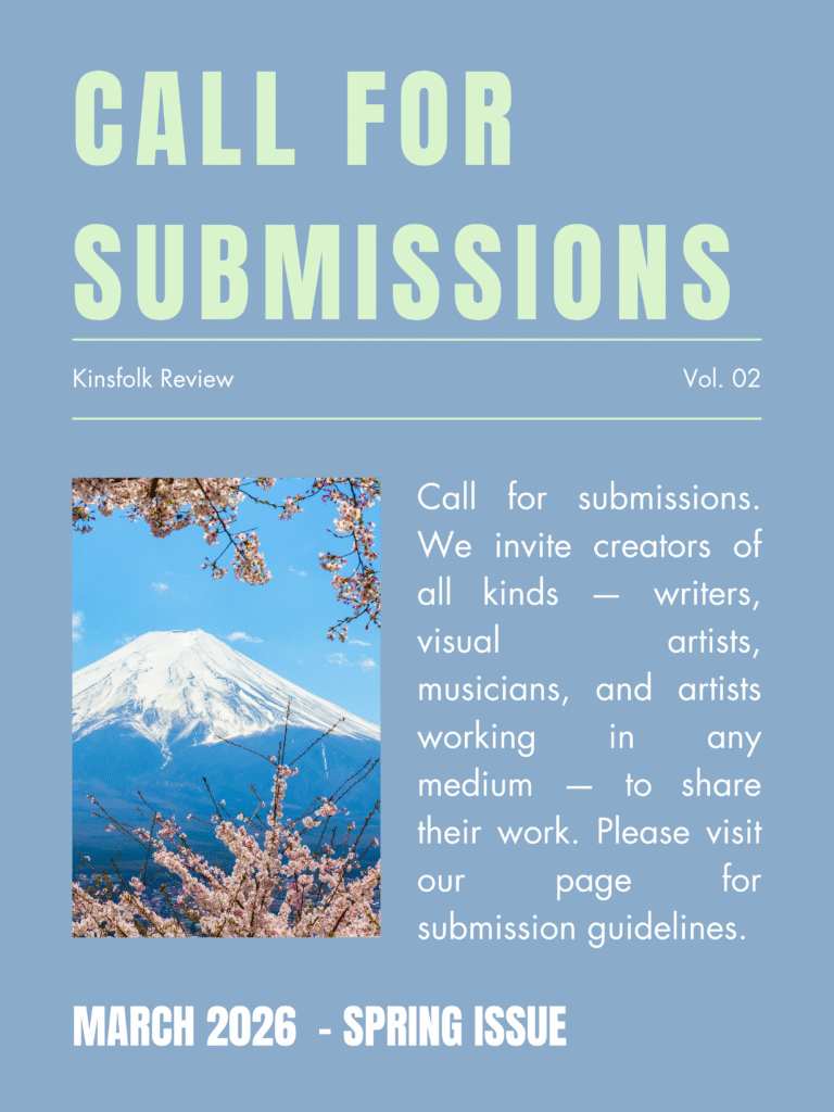 Kinsfolk Review is an open-access, multi-genre literary magazine committed to making publication more accessible and open. We publish writing across forms without charging submission or publication fees, and all accepted work is freely available to readers. While we are currently unable to offer payment, we aim to honour each contribution through careful editorial attention and thoughtful presentation, valuing clarity, inclusiveness, and the shared practice of reading and writing.